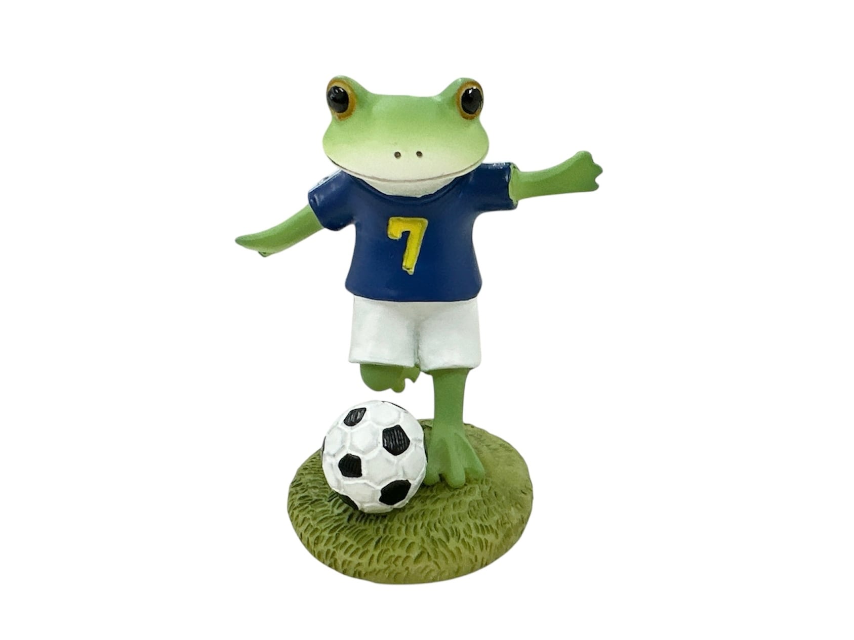 手のひらサイズのキュートなカエル、コポーシリーズの「シュートするサッカー選手のカエル」です。